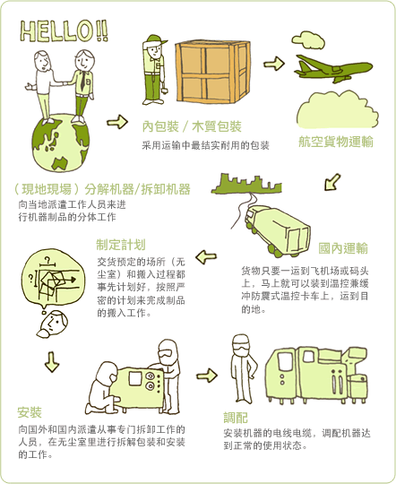 通过飞机或者是轮船运到国内的货物、等在飞机场和码头结束报关手续或者办理完了自家公司仓库里的保税货物等的报关手续后,就马上装货到空中悬挂式温控卡车上、安全正确的运送到目的地。同时我公司的员工在目的地待机等候、货物一到就开始卸货、在搬入车间之前还要在无尘室里进行机器零件的组装工作等。从运输到中间的各个相关流程、到最后的机器开始正常启动为止的所有工作我们都坚持负责到底。
