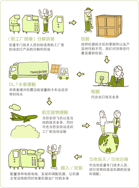 产品在包装和报关的手续结束之后、用卡车运到码头、按照货物到对方国家的时间来派遣专业技工到达当地。